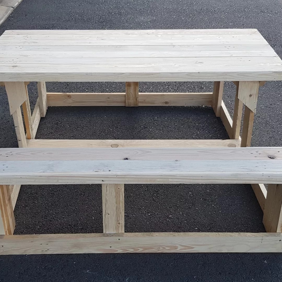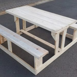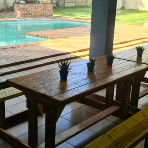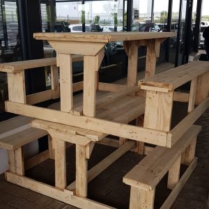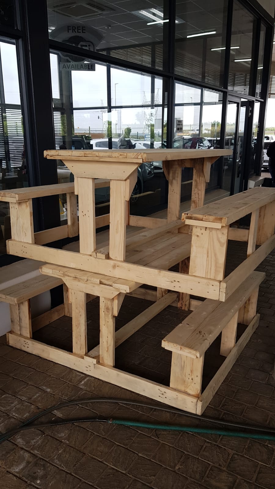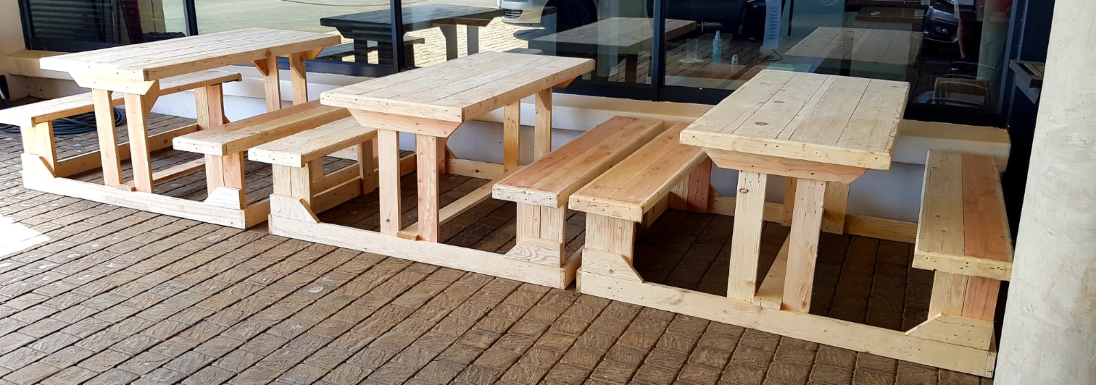 6 seater Wooden Picnic Tables & Benches at R1350 each, custom-made on demand and as many as you need. The tables are unvarnished and we use upcycled wood which makes this the ideal eco-friendly product for use in the home and business. The tables are screwed, glued and pinned together, so there are no unsightly large bolts sticking out.